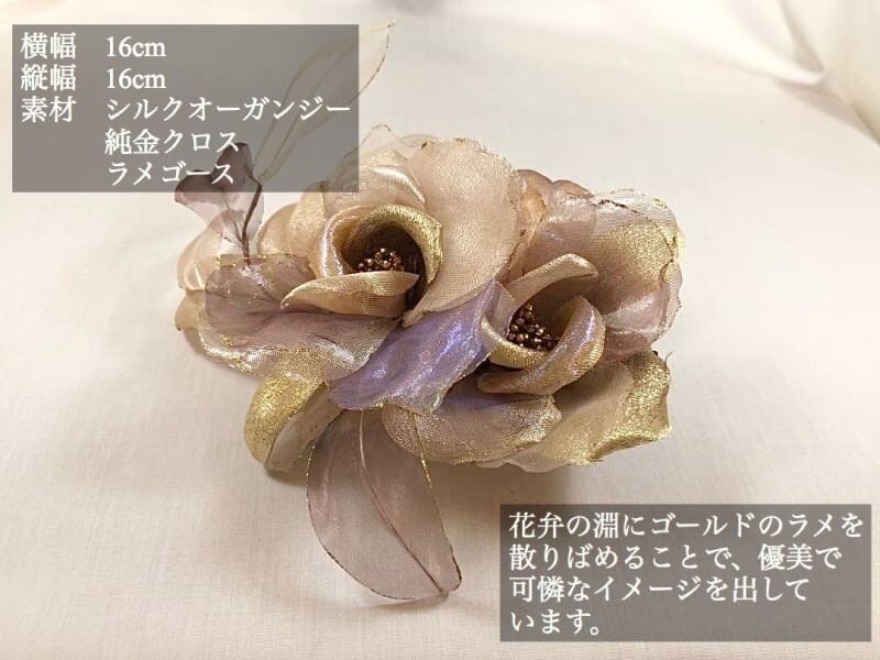シルクオーガンジー、純金クロス、ラメゴース、様々な素材を組み合わせたコサージュになります!
